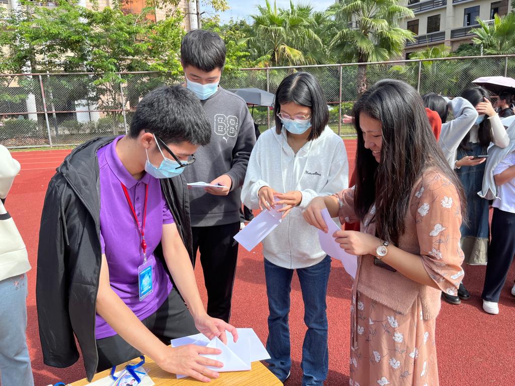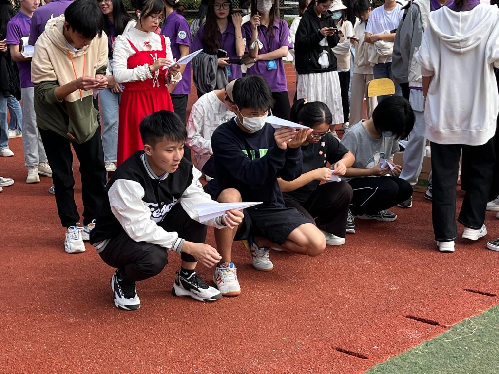 在个人赛中,选手在上场前需折叠好属于自己的纸飞机,我院老师与同学都积极参与到准备过程中。与此同时,观众在观赛过程中也会给选手们提出相应的建议,使其制作的纸飞机愈发完美。选手们跃跃欲试,在裁判的指令下,他们将自己乘载着必胜信念的纸飞机投掷飞出,在空中划出一道道弧线。在团体赛中,每组选手配合默契,不同的纸飞机在半空中循环飞行,赢得了观众们的声声喝彩,小足球场上洋溢着欢乐。
